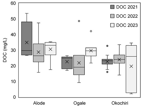DOC concentrations in the study area. The box’s edges represent the 75th and 25th percentiles, respectively. In the box, the “x” sign and the solid line represent the mean and median values, respectively. The branch gives the range of the data except for the outliers.