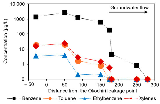 The relationship between groundwater benzene and other TEX concentrations and the distance from the petroleum pipeline leakage point in Okochiri for groundwater samples taken along the flow direction (transect A). The wells plotted are, from left to right, PSW 27, 28, 21, 22, 25, 26, 35, and REF 4.