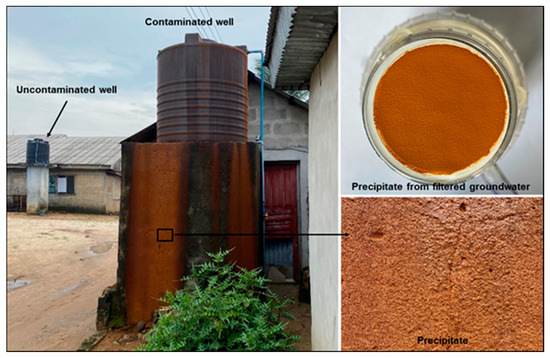 While the major ions and trace metal concentrations were relatively low or undetected in some wells, Fe2+ concentrations in some samples were elevated. Alode, Ogale, and Okochiri concentrations varied between 0.01 to 7 mg/L, 0.01 to 50 mg/L, and 0.01 to 25 mg/L, respectively. The highest concentrations were observed in wells located near the NNPCL pipeline in Okochiri and Ogale. Wells situated further away have lower concentrations, usually between 0.01 to 0.3 mg/L of Fe, and in some cases, they are undetected. Along the NNPCL petroleum pipelines, the accumulation of Fe precipitates as stains (reddish-brown rust particles) were observed on surfaces of (1) polyvinyl chloride (PVC) overhead tanks used for the storage of drinking water (Figure 6) and (2) plumbing fixtures, as well as other domestic water containers. This phenomenon usually occurs under oxic conditions [116,117,118]. The reddish-brown rust particles (Fe(OH)3) resulted from the reaction between Fe and DO in the groundwater, as shown by the following reaction: 4Fe2+ + O2 + 10H2O → 4Fe(OH)3 + 8H+. The precipitation was also observed in samples left sitting for about 10 min after abstraction, suggesting the release of Fe from the nearby underground pipelines.