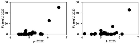 The relationship between Fe and pH in the groundwater in 2022 and 2023.