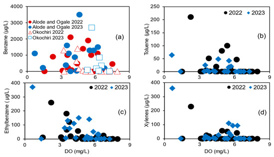 The relationship between (a) benzene vs. DO, (b) toluene vs. DO, (c) ethylbenzene vs. DO, and (d) total xylenes vs. DO in Alode, Ogale, and Okochiri groundwater.