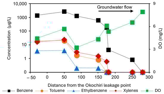 The relationship between DO, benzene, toluene, ethylbenzene, and xylenes concentrations along the groundwater flow direction (transect A) in Okochiri. From left to right, the wells plotted are PSW 27, 28, 21, 22, 25, 26, 35, and REF 4.