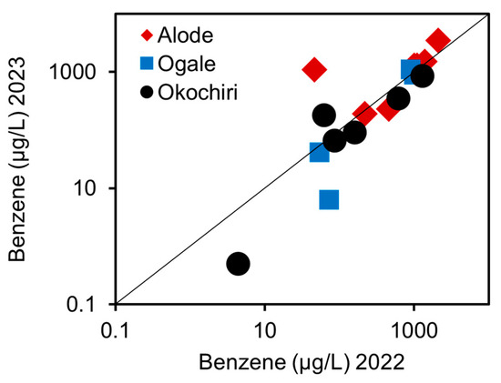 Typically, 100% DO saturation at 25 °C is 8.45 mg/L and, at 32.5 °C, only 7.2 mg/L. The highest values for DO were 7.4 mg/L at Okochiri, 5.9 mg/L at Ogale, and 7.5 mg/L at Alode. Similarly, the highest values for temperature were 32.5 °C at Okochiri, 31 °C at Ogale, and 31 °C at Alode. The groundwater temperature, therefore, appears to be a limiting factor to the aquifer’s benzene NA potential. The rate and efficiency of benzene degradation, however, do not only depend on the oxygen availability but also the discontinuous release of BTEX from the pollutant source, temperature, nutrient availability, and overall microbial activity in the groundwater environment [56,126,127,128,129]. In the case of Ogale, for instance, the benzene concentration in well PSW 11 decreased from 9280 μg/L [26] to 910 μg/L (this study) in 11 years but increased from 910 μg/L to 1100 μg/L in 1 year. Figure 10 shows a general comparison between benzene levels in 2022 and 2023. Besides two samples from Alode, which were significantly higher in 2023, benzene concentrations were similar for the two sampling campaigns. The lack of a consistent decline between 2022 and 2023 concentrations suggests that there may be a continuous release of benzene from the pipeline into the groundwater. Also, benzene concentrations in the three communities appear to exceed the capacity of microbial degradation. Therefore, the high initial concentration or continuous benzene release overwhelmed the NA capacity, slowing the degradation.