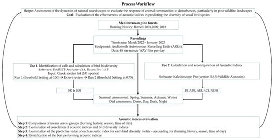 To systematically assess the response of animal communities to disturbances in post-wildfire landscapes, we implemented a multi-step approach combining acoustic indices and bird biodiversity data. The process workflow presented in Figure 1 stands as a visual representation of the steps taken in this study, outlining the key phases, tools, and analyses.