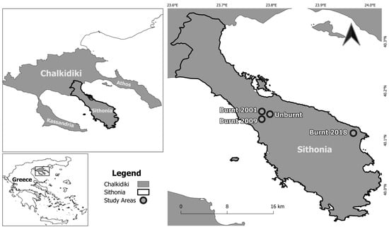 The research was conducted at four Mediterranean pine forests (dominated by Aleppo pines (Pinus halepensis)) on the Sithonia Peninsula (Chalkidiki prefecture) in northern Greece (Figure 2). All selected areas are public land managed by the Forestry Service and within the Natura 2000 network, and they form part of a mostly contiguous pine forest that extends along the central, hilly part of the peninsula. The four areas were selected to have different fire burning histories. We considered a forest that had not been burnt for at least twenty years as “unburnt”. The other three areas were each within the boundaries of three wildfires that burned the Aleppo pine forests in 2001 (396 ha burnt), 2009 (46 ha burnt), and 2018 (610 ha burnt). All the forests were left to naturally regenerate following the fires.