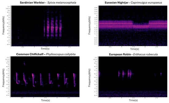 This approach has gained popularity as autonomous recording units (acoustic sensors) have become more affordable [19] and acoustic analysis tools are more accessible to non-specialists, enabling citizen science participation [20]. As citizen science in bird-watching and monitoring evolves, tools like eBird, managed by the Cornell Lab of Ornithology, support professional scientists and naturalists in contributing valuable data on bird distributions and species diversity [21]. Calculating traditional biodiversity metrics such as the species richness or diversity indices from acoustic recordings requires the detection of individual calls, which is time-consuming and necessitates expertise and manual identification by ornithologists and ecologists [22,23]. To this end, the introduction of automated tools similar to BirdNET [24] has revolutionized this process, reducing the need for intensive manual labeling, making bird identification more efficient. Advancements like image classification techniques and deep learning models have expanded automation classification capabilities, demonstrating high accuracy across various audio datasets, including eBird hotspots [25].