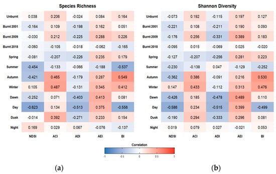 Spearman rank correlation coefficients (ρ) of acoustic indices (NDSI, ACI, BI, ADI, AEI) and (a) species richness and (b) Shannon Diversity Index across different areas, seasons, and time periods.