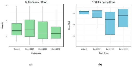 Box plots of acoustic indices across different forest burning histories: (a) NDSI for dawn and spring (Kruskal–Wallis test p-value: < 0.001); (b) BI for dawn and summer (Kruskal–Wallis test p-value: < 0.001).
