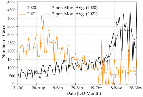 New cases per day in Oklahoma during the football seasons of 2020 (black line for 1 August–5 December) and 2021 (orange line for 1 August–1 December), along with their 7-day moving averages (dashed lines of respective colors for each season) [].