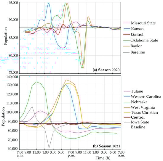 2020 Season: Compared to that of the control weekend, the population for each gameday in 2020 was significantly greater according to t-tests (p < 0.01, respectively). The population for the control day was never greater than the baseline population in 2020. For all days that were sampled, the before-game group was the same as the during-game group (p = 0.14). The difference between the before-game group and the late-night group was significant (p = 0.01). The during-game group was also significantly different from the late-night group when all sampling days were analyzed together (p < 0.01), which indicates the dynamic effect of the population moving into a specific region to follow the game.