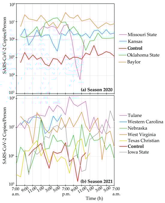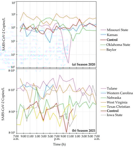 Figure 3 presents daily viral concentrations during each season separately, establishing a common hourly time axis. Here, comparisons were made across games within each season, across seasons, and against the control samples, as well as with days surrounding the sampling day (either actual gameday or control). Looking first at within-gameday SARS-CoV-2 concentration variability (defined in Section 2.4), it should be noted that statistically significant comparisons could not be performed because for each time category (before, during, after, and late night), there were only four samples available.