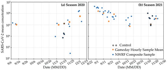 Gameday and control mean SARS-CoV-2 concentrations (blue dots) compared to the concentration from the City of Norman, Oklahoma (NWRF) (orange squares), over the course of the (a) 2020 season; (b) 2021 season. The control dates are distinguished by a black frame.