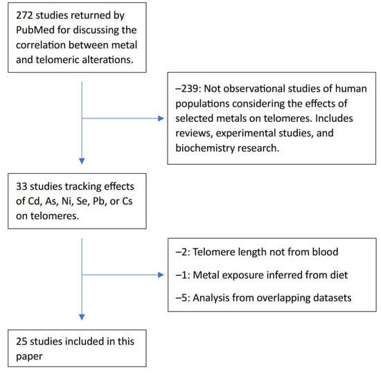Chicago/Turabian StyleBeddingfield, Zachary, Chao Ji, Gregory M. Zarus, Patricia Ruiz, Obaid Faroon, Henry Abadin, Breanna Alman, James M. Antonini, and Mohammad Shoeb. 2024. "Review of Correlations Between Telomere Length and Metal Exposure Across Distinct Populations" Environments 11, no. 12: 280. https://doi.org/10.3390/environments11120280