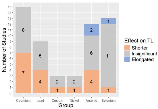 Beddingfield, Z.; Ji, C.; Zarus, G.M.; Ruiz, P.; Faroon, O.; Abadin, H.; Alman, B.; Antonini, J.M.; Shoeb, M. Review of Correlations Between Telomere Length and Metal Exposure Across Distinct Populations. Environments 2024, 11, 280. https://doi.org/10.3390/environments11120280