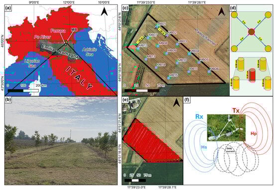 (a) Location of the sampling area (MB), in the Northeast sector of the municipality of Ferrara in the Emilia–Romagna region (Northeastern Italy); (b) the hazel orchard–grassland field before the geochemical and geophysical investigation of 19 October 2021; (c) soil sampling locations represented by light blue dots; (d) at each location, a sample was collected and mixed with five aliquots of soil per square probed at a depth of 0–30 cm; (e) geophysical measurements were indicated with red dots and georeferenced with an internal GPR; and (f) a Profiler EMP-400 (GSSI) was used to acquire the Hp and Hs electromagnetic fields at different positions.