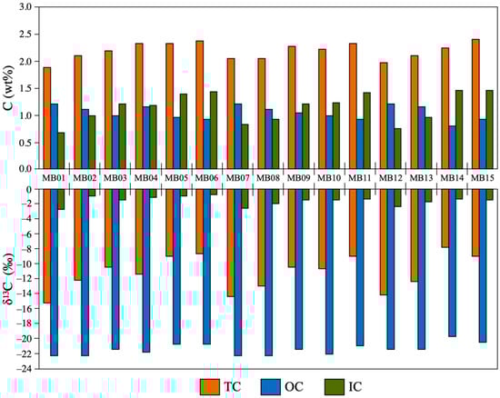 In the dataset, the TC varied between 1.89 wt% (MB01) and 2.40 wt% (MB15), with an average of 2.19 wt%. The isotopic δ13CTC yielded values varying from −15.3‰ (MB01) to −7.8‰ (MB14), with an average of −11.2‰. The OC varied between 0.79 wt% (MB14) and 1.22 wt% (MB12), with an average of 1.05 wt%. The δ13COC provided values from −22.4‰ (MB02) to −19.7‰ (MB14), with an average of −21.4‰, indicating the predominance of organic matter, which typically has negative isotopic C values, as it reflects the photosynthetic pathways of the source vegetation []. The IC varied between 0.68 wt% (MB01) and 1.46 wt% (MB15), with an average of 1.14 wt%. The calculated δ13CIC yielded values varying from −2.7‰ (MB01) to −0.7‰ (MB06), with an average of −1.6‰, indicating the predominance of inorganic C, with an isotopic signature similar to that of the international standard.