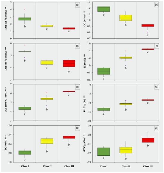 Boxplots of the (a) LOI 105 °C, (b) LOI 550 °C, (c) LOI 1000 °C, (d) TC, (e) OC, (f) IC, (g) δ13CTC, and (h) δ¹³COC of the samples divided into three classes based on their aspect in the field and OC/IC ratio (see the text for details). In each box plot, the black line represents the median. Letters below the box plots represent the results of the Tukey post hoc test. Different letters denote significant differences between classes. The one-way ANOVA results are also reported (** p < 0.001; *** p < 0.0001).