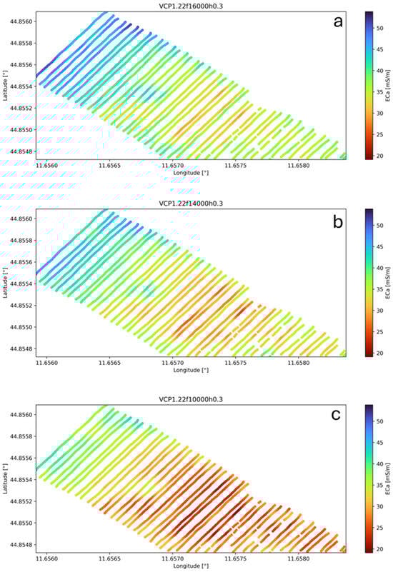 Spatial variability and distribution of the ECa values obtained from the EMI acquisition field survey using three different frequencies: (a) 16, (b) 14, and (c) 10 kHz.