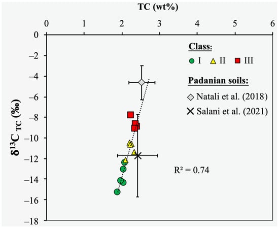 The elemental TC contents and δ¹³CTC of MB samples and average elemental TC contents and δ¹³CTC recognized as deposits from the paleochannel and levee of the easternmost Padanian plain soils, as studied by Natali et al. [] and Salani et al. [].