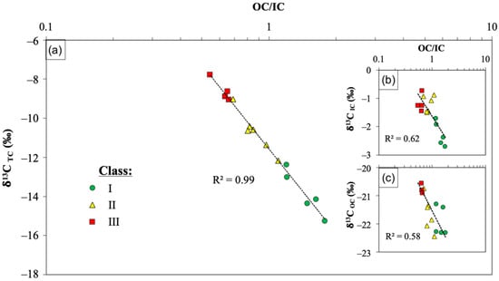OC/IC (in logarithmic scale) versus (a) δ13CTC shows a strong negative correlation; the insets reproduce the relationships between OC/IC, (b) δ13CIC, and (c) δ13COC.