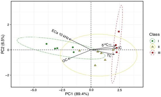 Principal component analysis (PCA) was calculated using the elemental fractions of C and the isotopic signature δ13CTC measured for each of the 15 samples and field ECa extracted from the ECa map in the same sampling positions (Figure 4; Table S2). The resulting PCA (Figure 7) explains more than 96% of the variance and accurately clusters the Class I and Class III samples, which offer, respectively, the highest and lowest OC/IC ratios. As shown in Figure 3e–g, the Class II samples show intermediate characteristics between Class I and Class III. Therefore, these samples overlap in the PCA plot more strongly than the other two clusters.