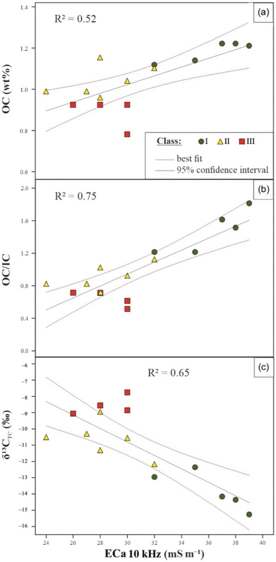 In the MB context, higher ECa values indicate soil with the ability to retain pore fluids, which correlates with the high CEC of the finest sediment, i.e., clay minerals []. Consequently, there is a correlation between ECa and SOM, as organic matter is generally hosted in clay minerals [,]. Therefore, we correlated the apparent electrical conductivity values extracted from the ECa maps in Figure 4 with the OC/IC ratio and isotopic signatures of total (TC), OC, and inorganic (IC) carbon estimated from the collected samples. In general, the ECa positively correlates with the OC contents and OC/IC and negatively correlates with δ13CTC, as the most negative values are typical of samples rich in organic matter []. Although the correlations were quite similar at different frequencies, the best R2 values were obtained using the ECa data at 10 kHz. In detail, the OC/IC offered the best index of correlation R2 (0.75; Figure 8a), while the R2 values were smaller for the ECa correlation between OC and δ13CTC (0.52 and 0.65, respectively; Figure 8b,c) due to the trend shown by the samples of Class III, which are more influenced by the IC contents.