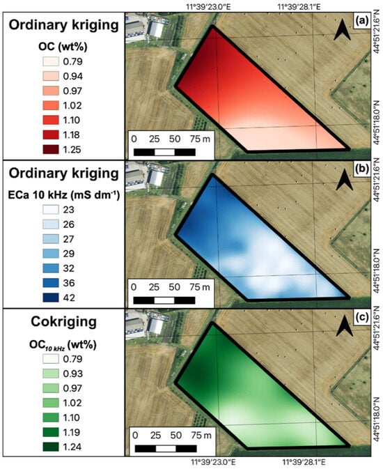 Finally, to demonstrate the spatial distributions of OC and the ECa values, we generated predictive maps using the interpolation method of ordinary kriging (Figure 9). A comparison between Figure 9a,b indicates that the OC content and ECa variables were correlated, as the northwesternmost section of the field yielded the highest values for OC contents and ECa, as both organic matter and water are mainly hosted in the fine sediments of the soil (i.e., clay). Conversely, the southeasternmost section containing mostly coarse granulometry (i.e., sand), presented the lowest values of OC contents and ECa, indicating the scarce sequestration of OC and water contents in the soils of this area. To improve the precision of the OC surface’s predictive map (Figure 9c), we also performed cokriging. In co-kriging, one or more observed variables (known as co-variates, which are often correlated with the variable of interest) are generally used to improve the precision when interpolating the variable of interest []. In this case, we considered the OC data as the first variable and the ECa data measured at 10 kHz as the covariate variable. The obtained co-kriging map offers a snapshot of the OC contents in the soils and can also be read easily by farmers, who may not have strong scientific backgrounds, enabling them to make the correct decisions to improve OC sequestering and plan future crops.
