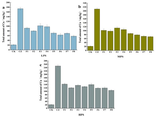 (a), (b) and (c) represent the total copper content of each treatment in low, medium, and high concentration pig manure, respectively. Pig manure (CZ) and pig manure with the addition of 2.5% bentonite (F1), 7.5% bentonite (F2), 2.5% biochar (F3), 7.5% biochar (F4), 2.5% biochar + 2.5% bentonite (F5), 2.5% biochar + 7.5% bentonite (F6), 7.5% biochar + 2.5% bentonite (F7), or 7.5% biochar + 7.5% bentonite (F8). LPS, MPS, and HPS represent pig manure–soil mixes with low, medium, and high Cu concentrations, respectively.