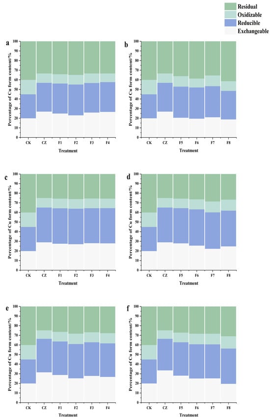 The distribution rate is a crucial indicator for assessing the environmental risk associated with heavy metal contamination. Figure 2a,c, and e show that the exchangeable Cu concentration in F2 is relatively low. Figure 2a (LPS) shows that the addition of 7.5% bentonite (F2) leads to a decrease in the exchangeable state and an increase in the residual state, thereby enhancing the transformation of Cu from an active to an inert state compared to CZ. Figure 2b suggests that treatments F5 to F8 led to a reduction in the exchangeable state and an elevation in both the oxidized, reduced, and residual states compared to CZ. Consequently, incorporating composite passivators can effectively enhance the stability and reduce the mobility of Cu. Notably, after introducing composite passivators to LPS, treatments F5, F6, F7, and F8 showed decreases in exchangeable Cu distribution rates by 6.4%, 7.4%, 5.9%, and 8.1% compared to CZ. The ranking order for the exchangeable Cu passivation rates after the composite applications is as follows: F8 > F6 > F5 > F7 > CZ. Furthermore, there was an increase in the residual Cu distribution rates across the F5, F6, F7, and F8 treatment groups of 2.8%, 5.3%, 2.1%, and 8%, respectively.