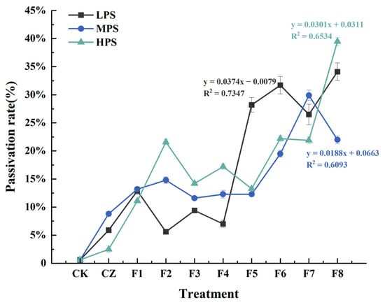 Figure 3 shows that a higher exchangeable passivation rate corresponds to a passivator having a more effective passivation effect on Cu in pig manure. The figure indicates that F8 had a passivation rate of 34.10% in LPS, which suggests that the addition of a composite comprising 7.5% biochar and 7.5% bentonite is more effective than using only one passivator. Comparatively, F2 shows slightly lower efficacy compared to CZ, suggesting that adding 2.5% bentonite alone has limited impact on Cu passivation in the low-concentration pig manure–soil mix. In MPS, F7 had a passivation rate of 29.90%, which suggests that incorporating a composite consisting of 7.5% biochar and 2.5% bentonite effectively passivates Cu at medium Cu concentrations. The individual addition of biochar (F3 and F4) had a lower effect than the individual addition of bentonite (F1 and F2), which implies that bentonite has superior Cu-passivating effects in MPS. In HPS, F8 (7.5% biochar and 7.5% bentonite) had a passivation rate of 39.50%, indicating an excellent Cu passivation performance. F2 achieved the highest passivation rate among the single passivation agents and shows that both single and composite passivating agents containing 7.5% bentonite had significant effects on Cu passivation. This finding is consistent with reports that montmorillonite [] exhibits multiple adsorption mechanisms, involving both physical and chemical processes during the adsorption of heavy metal Cu, and has excellent potential as a passivating agent.