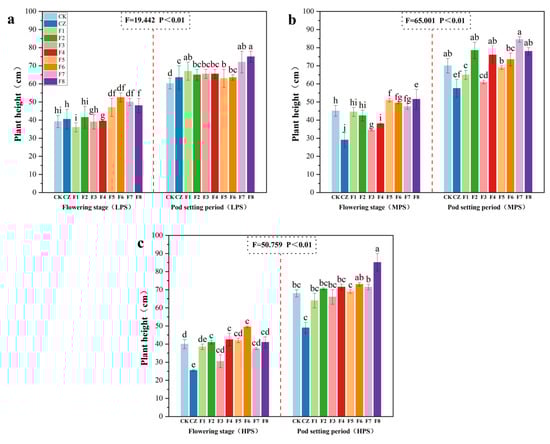 Plant heights (cm) for the treatments at the flowering and podding stages in LPS (a), MPS (b), and HPS (c). The a, b, and c on error line lettering indicate differences between treatments (p < 0.05). Note: lowercase letters (a, b, c) indicate significant differences between various treatments (p < 0.05).