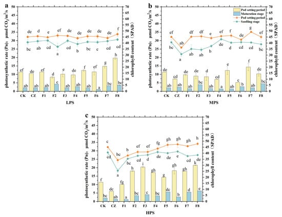 Photosynthetic rates (Pn: mol CO2/m2/s) and chlorophyll contents (SPAD) for each treatment. LPS (a), MPS (b), and HPS (c). The bar chart represents the podding and maturity stages for soybeans, while the line chart represents the seedling and podding stages.