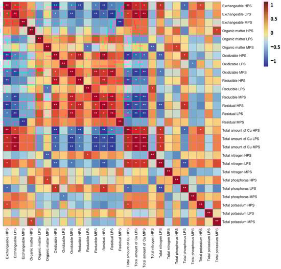 The relationship between the alterations in copper content and forms in LPS, MPS, and HPS for each soil indicator. * denotes 0.01 < p < 0.05, ** indicates 0.001 < p < 0.01.
