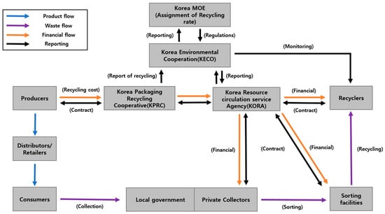Figure 1 shows the material and financial flows of the EPR system in Korea. In the case of packaging materials, product producers using packaging materials pay a collecting and recycling cost to the KPRC (Korea Packaging Recycling Cooperative, collective PRO) according to the amount of packaging materials manufactured. The KPRC provides the cost as subsidies to recycling and collection companies through KORA (Korea Resource Circulation Service Agency). The collection and recycling costs are determined by the government and vary each year [,]. As of 2023, EPR fees for PVC packaging material are the highest at a rate of USD 723/ton, followed by USD 287/ton for composite PET bottles. EPR fees for colorless PET bottles and colored PET bottles are USD 112/ton and USD 187/ton, respectively. The lowest-rate item is glass bottles at USD 30/ton [].