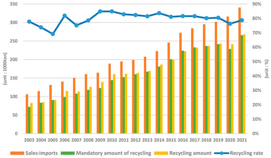 Figure 2 shows the sales (domestic demand)·imports volume, recycling rate target, and actual recycling amounts of PET bottle between 2003 and 2021. The target recycling rates of PET bottles were mostly achieved over these years under the EPR system. However, in the case of colorless PET bottles, actual recycling amounts were less than that set as the target rate in 2016 and 2017 [].