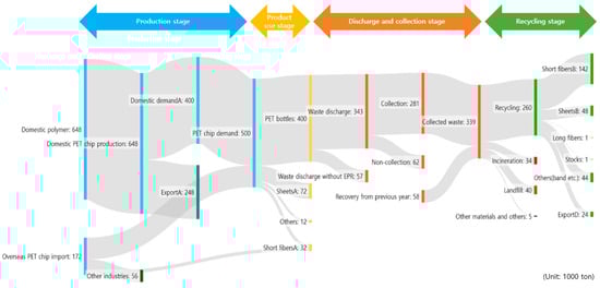 In order to identify the proper methods and treatment of PET plastics, many previous studies conducted the analyses of material flows for PET bottles. For example, Smith et al. [] conducted a material flow analysis of PET resin in the USA. Furthermore, some solutions for barriers in PET collecting, sorting, and recycling steps were suggested. Schmidt et al. [] analyzed the material flow of PET bottles in Austria, Germany, and Serbia to reveal the relation between material efficiency and environmental impacts. Eygen et al. [] analyzed the material flow of plastic packaging and proposed raising the recycling target rate to promote the recycling of resources in plastic packaging. Millette et al. [] suggested that a material flow analysis of plastic can be applied as valuable data for policy decision makers on circular economy development. However, research on the quantitative analysis of PET is insufficient in Korea due to the lack of relevant statistics and information. Furthermore, there are many challenges faced by the PET recycling industry, owing to a price drop of recycled PET resin, difficulties in sorting and recycling various designs of PET products (e.g., color, plastic composite), and politico-economic trends around the world such as China’s plastic waste import ban in 2018.