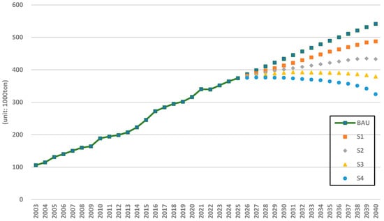 Figure 4 presents the predicted consumption demand for PET bottles between 2022 and 2040 by scenario. In 2022, a total of 328 thousand tons of PET bottles was sold []. Under the BAU scenario, the market demand for PET bottles will increase steadily, and it is estimated to reach 434 thousand tons in 2030 and 542 thousand tons in 2040. Under Scenarios 1 and 2, the growth rate of PET bottle consumption showed slight decrease compared to BAU. It was predicted to be 413 thousand tons and 401 thousand tons in 2030, and 487 thousand tons and 433 thousand tons in 2040, respectively. Scenario 3 showed relatively constant trends in the consumption of PET bottles. It was predicted to be approximately 391 thousand tons in 2030 and 379 thousand tons in 2040. Scenario 4 was the only one that showed a decreasing trend in PET bottle consumption. It was estimated to be 375 thousand tons in 2030 and 325 thousand tons in 2040, which is similar to the value of PET bottles consumed in 2022.