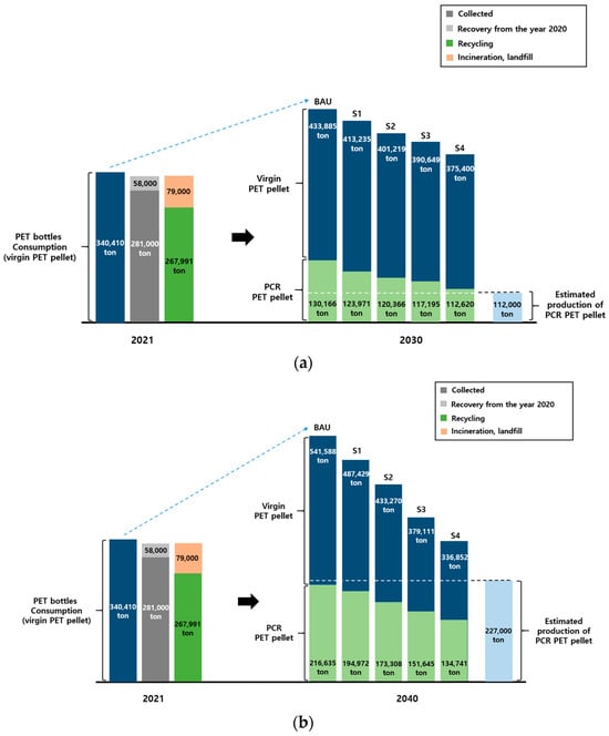 Figure 5 shows the predicted demands on post-consumer recycled PET (PCR or r-PET) in bottles in 2030 and 2040. We assumed that the use of recycled material in the production of PET bottles is to be 30% in 2030 and 40% in 2040, respectively, and all produced-for-food-grade recycled PET resins (i.e., food grade r-PET chips) are distributed domestically for use. There are a total of 24 r-PET flake recycling facilities and only 4 r-PET chip manufacturers available in Korea as of October 2023. Production of r-PET material is expected to continuously increase due to the regulation of mandatory use of recycled material in PET bottles. However, most of the useable-for-food-containers-grade recycled PET materials produced in Korea are currently exported to the USA and Europe. Considering the capacity of r-PET chip manufacturers in Korea, total production for PET bottles is anticipated to be approximately 112 thousand tons in 2030 and 227 thousand tons in 2040, respectively [,,,].