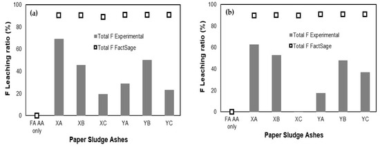 For B, the leaching ratio is shown in Figure 8, and it seems that the leaching ratio at an addition ratio of 10% had a good agreement between the PS ash YB and the relative error of 4.97%. Upon increasing the mass addition ratio to 30%, the B leaching ratio had a good agreement for the PS ash YC, with a relative error of 1.26% (see Table 5). Overall, PS ash, when used as an additive, can control the leaching concentrations of TEs, including B, F, and Se [17,18]. The same pattern was also found for Se, as shown in Figure 10. The Se leaching ratio at an addition ratio of 10% was achieved at around 96.61–98.68%, and increasing the addition ratio increased the Se leaching ratio to 96.94–99.28%, with a relative error of 0.73–3.45%. On the other hand, the F leaching ratio was much lower than the FactSage simulation, making the relative error achieved range from 35% to more than 100%. The possible reason is the kinetic control during the leaching test due to a lack of agitation and the short residence time [15]; therefore, the thermodynamic calculation (FactSage 7.2) did not consider the reaction time, which is necessary for the theoretical equilibrium state to be reached [30].