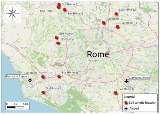 Figure 1 shows the location of sampling points in the urban areas of Rome, Italy. Rome, one of the largest urban regions in the northern Mediterranean basin, spans 5363.22 km2 with over 4.3 million inhabitants and has a population density of 788 inhabitants per km2 [74].
