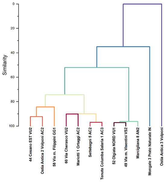 This study focused on twelve locations across metropolitan Rome (Figure 1). The concentrations of twelve PTEs were measured in each location. However, Hg and Cd did not exhibit detectable values during the analysis and were thus excluded from further analysis (descriptive statistics, principal component analysis (PCA), cluster analysis, and Pearson correlation matrix).