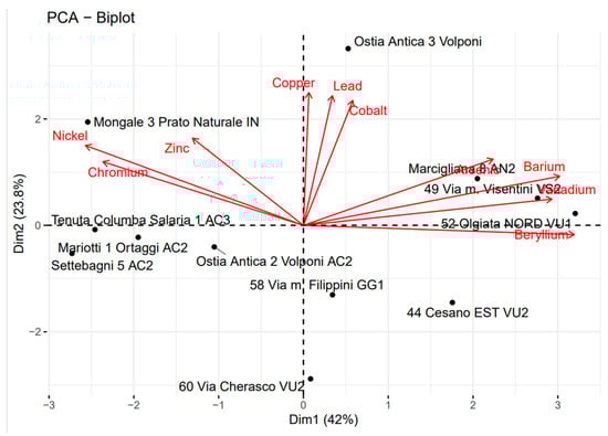 The bar chart depicting individual PTE content in 12 sampling locations of Rome, cluster analysis, three-dimensional principal component analysis (PCA) biplot for sampling locations and PTEs, and Pearson correlation coefficient matrix for PTEs under the study were performed using the OriginPro Software 2021 version [88]. Subsequently, the two-dimensional principal component analysis (PCA) biplot for sampling locations and PTE content was performed using free Software R 4.2.2 version (RStudio) [86].