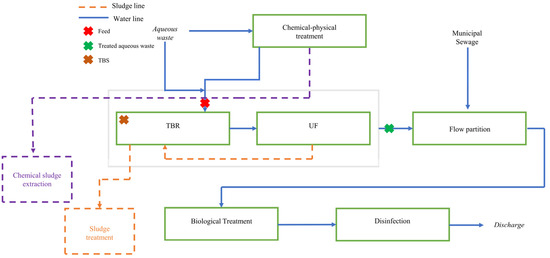 As seen from the plant scheme, AW have two treatment options based on their characteristics. Waste is pre-treated in batches in two physico-chemical compartments to safeguard the thermophilic biomass (T = 48 °C). The TBR has a volume of 1400 m3 and is characterized by an average inlet flow rate Qin = 170 m3d−1, with a hydraulic retention time HRT of almost 8.0 d, as reported by Collivignarelli et al. the hydraulic retention time was studied in an experimental work using a pilot plant [9]. To improve the performance of the sludge and obtain a more compact biomass, a dissolved oxygen concentration of 1.5–2 mg L−1 is guaranteed in the reactor by injecting pure oxygen. Inside the biological tank, different areas have different concentrations of oxygen; this management strategy allows for both the aerobic removal of organic substance in the zone of high oxygen concentration (2 mgO2 L−1) and denitrification in the anoxic zone (<1 mgO2 L−1). As mentioned previously, the TBR is coupled to an ultrafiltration system due to the poor settleability of the thermophilic biomass probably caused by its carbohydrate content [24]. The platform is therefore equipped with two parallel UF units. The UF unit is composed of 6 vessels with 99 ceramic membranes (cut-off 300 kDa) with an operating pressure between 3 and 5 bar. As shown in Figure 1, the UF retentate is recirculated into the biological reservoir thus ensuring low excess sludge extraction.