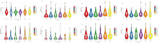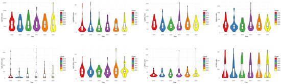 - The application of advanced descriptive statistics (violin graphs) to describe the variability of each parameter monitored over the five years; this allowed reporting univariate probability distributions of the values observed based on the density profile kernel estimation;