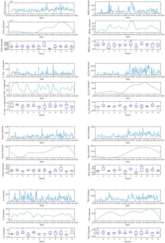 To evaluate the presence of a random component and a periodic component in the parameters loaded to the aqueous waste treatment platform an algorithm called STL (“Seasonal and Trend decomposition using Loess”) has been applied [29]. STL is a technique used for time series analysis and forecasting [30]. The objective was therefore to decompose a time series into easy-to-interpret components such as trends, seasonality, and noise. We will look for monthly seasonal components based on the variability of the influential loads and the trend in the five years of interest.