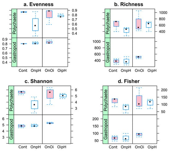 Boxplots of (a) evenness (Pielou’s J), (b) richness, (c) Shannon’s H’ and (d) Fisher’s alpha diversity indices for each bacterial host (gastropod and polychaete). The following treatments are represented in the X-axis: Cont—control; OnpH—reduced seawater pH; OnOi—oil-contaminated; pHOi—reduced seawater pH and oil-contaminated.