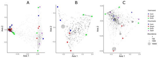 Ordination showing the first two axes of the principal coordinates analysis (PCoA) of ASV composition of (A) both polychaete Hediste diversicolor and gastropod Peringia ulvae; (B) only the polychaete; and (C) only the gastropod. Symbols are color-coded and represent samples from the different treatments as shown in the legend on the right side of the plots: Cont—control; OnpH—reduced seawater pH; OnOi—oil-contaminated; pHOi—reduced seawater pH and oil-contaminated. Grey symbols represent weighted average scores for ASVs. The symbol size is proportional to abundance (number of sequences reads).
