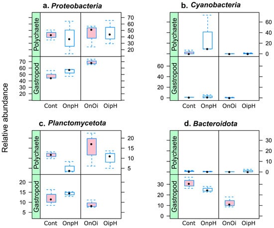 Boxplots of the relative abundances of (a) Proteobacteria, (b) Cyanobacteria, (c) Planctomycetota, and (d) Bacteroidota for each host (gastropod Peringia ulvae and polychaete Hediste diversicolor). The following treatments are represented in the X-axis: Cont—control; OnpH—reduced seawater pH; OnOi—oil-contaminated; pHOi—reduced seawater pH and oil-contaminated.