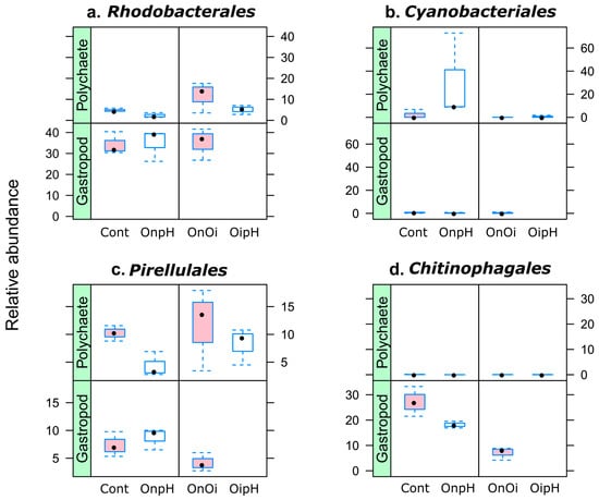 Boxplots of the relative abundances of (a) Rhodobacterales, (b) Cyanobacteriales, (c) Pirellulales, and (d) Chitinophagales for the gastropod Peringia ulvae- and the polychaete Hediste diversicolor-associated bacterial communities. The following treatments are represented in the X-axis: Cont—control; OnpH—reduced seawater pHreduced seawater pH; OnOi—oil-contaminated; pHOi—reduced seawater pH and oil-contaminated.