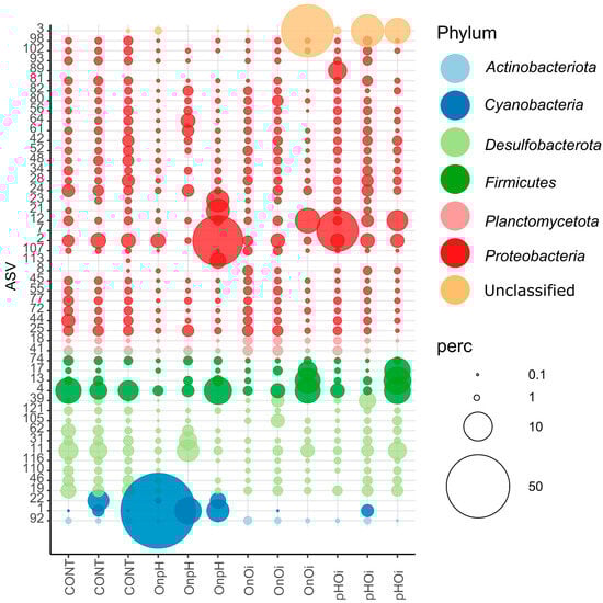 Relative abundance of the most abundant ASVs in the gastropod Peringia ulvae-associated bacterial communities and color-coded according to prokaryotic phylum. The circle size of the ASV is proportional to the mean percentage (perc) of sequences per treatment as indicated by the symbol legend in the upper right corner of the figure below the phylum assignment legend. The following treatments are represented in the X-axis: CONT—control; OnpH—reduced seawater pH; OnOi—oil-contaminated; pHOi—reduced seawater pH and oil-contaminated.